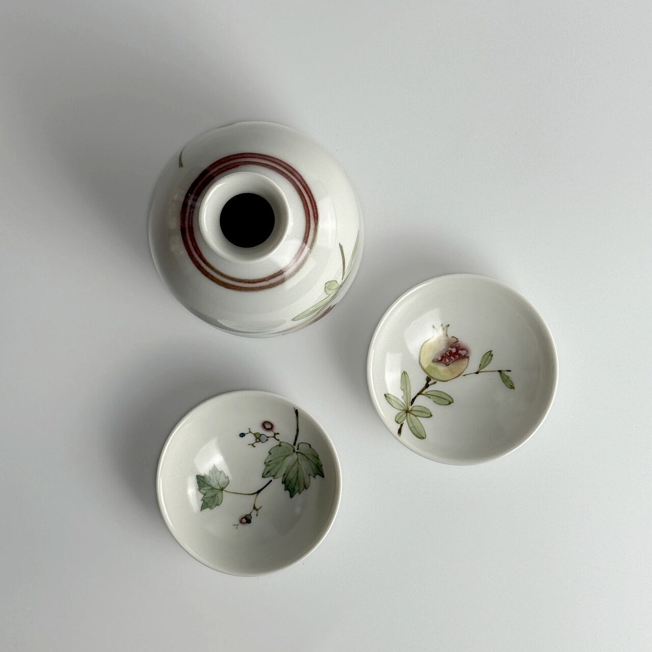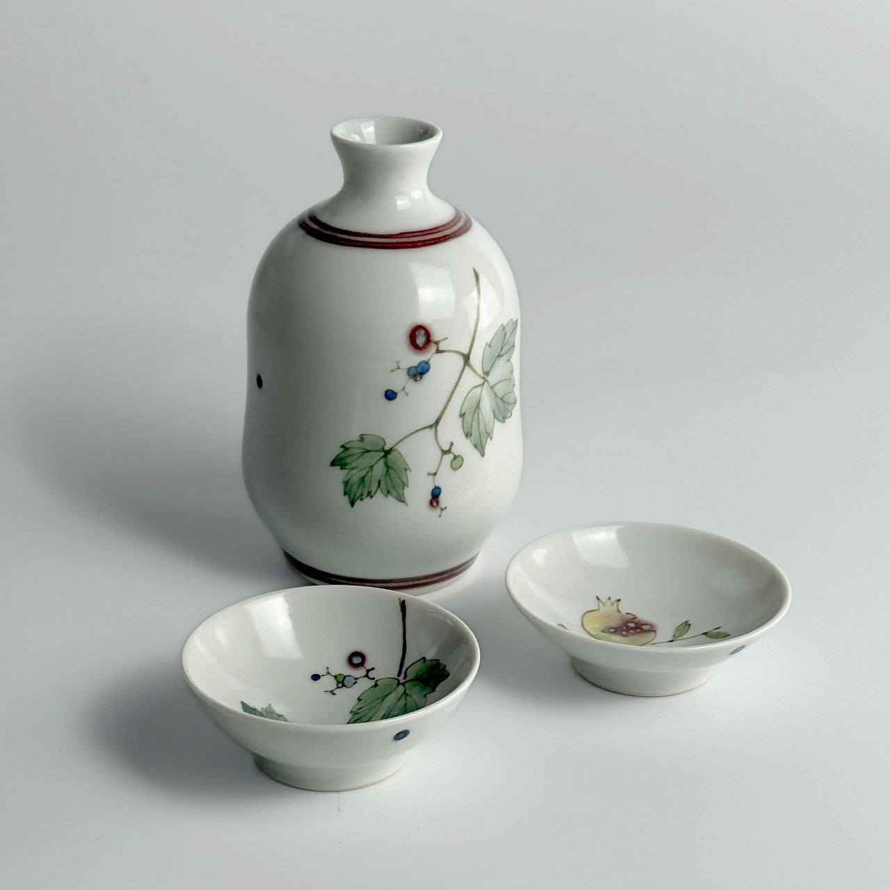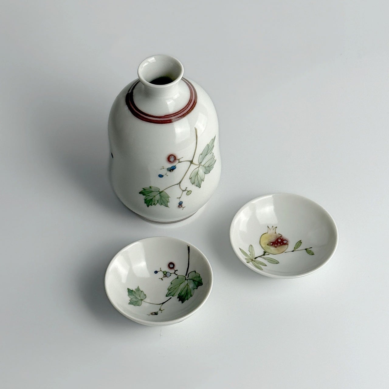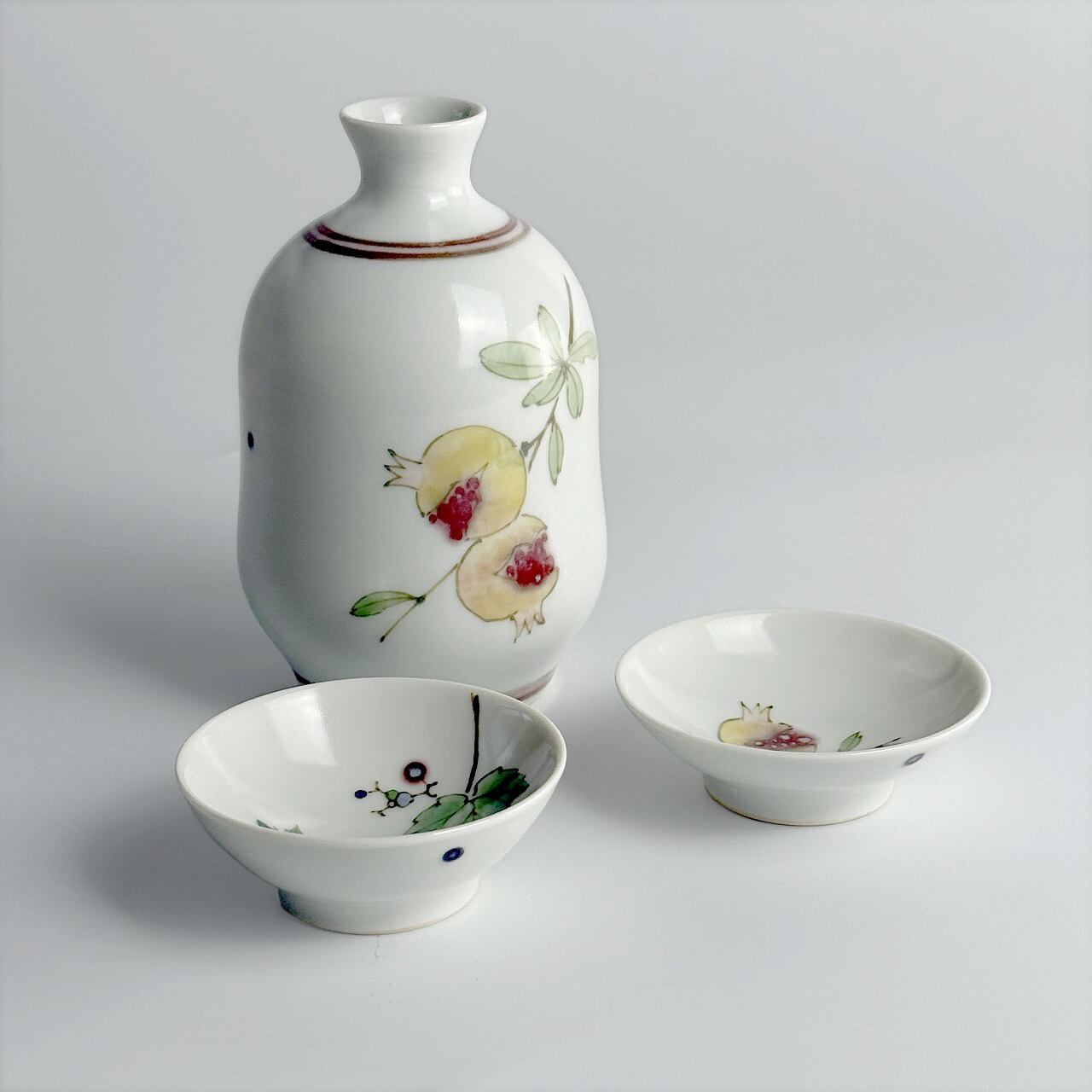 手書きの優しい絵柄が魅力の「酒器組み物 ザクロ」です。繊細なタッチが、ひとつひとつの作品に温かみを与えています。お酒を注ぐ瞬間から感じられる、楽しい時間を演出します。華やかなデザインは、食卓を華やかに飾るだけでなく、インテリアとしても素敵な存在感を放ちます!