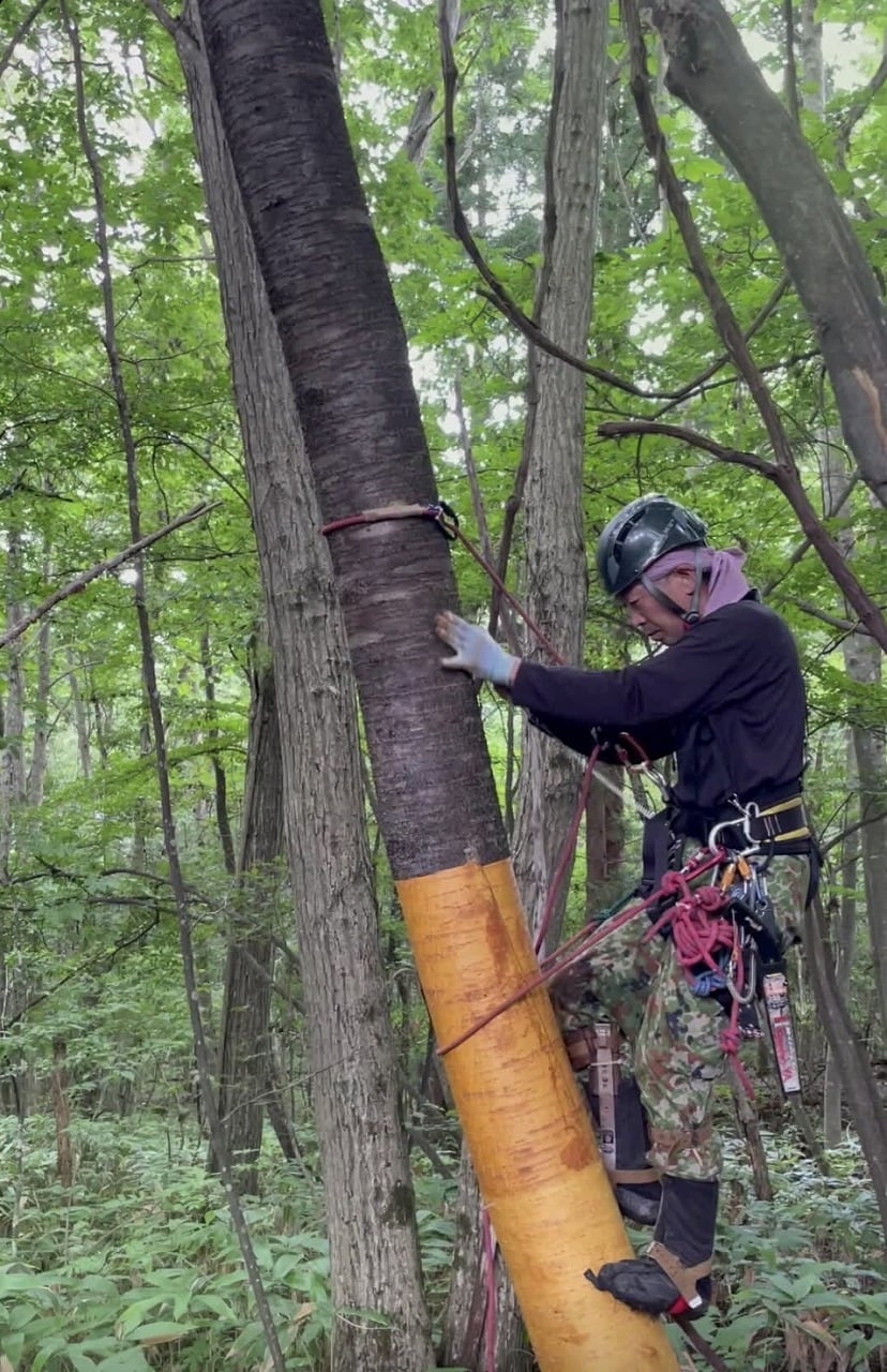 同社によると、樺細工の材料調達は重労働という。2人で岩手県内の山林に車で片道3時間以上かけて向かい、ヤマザクラの木に登って樹皮を採取しているが、体力的に作業時間は2、3時間が限界という。樹皮が幹から浮き上がるのは梅雨明けから9月上旬までのため、作業時期も限られる。